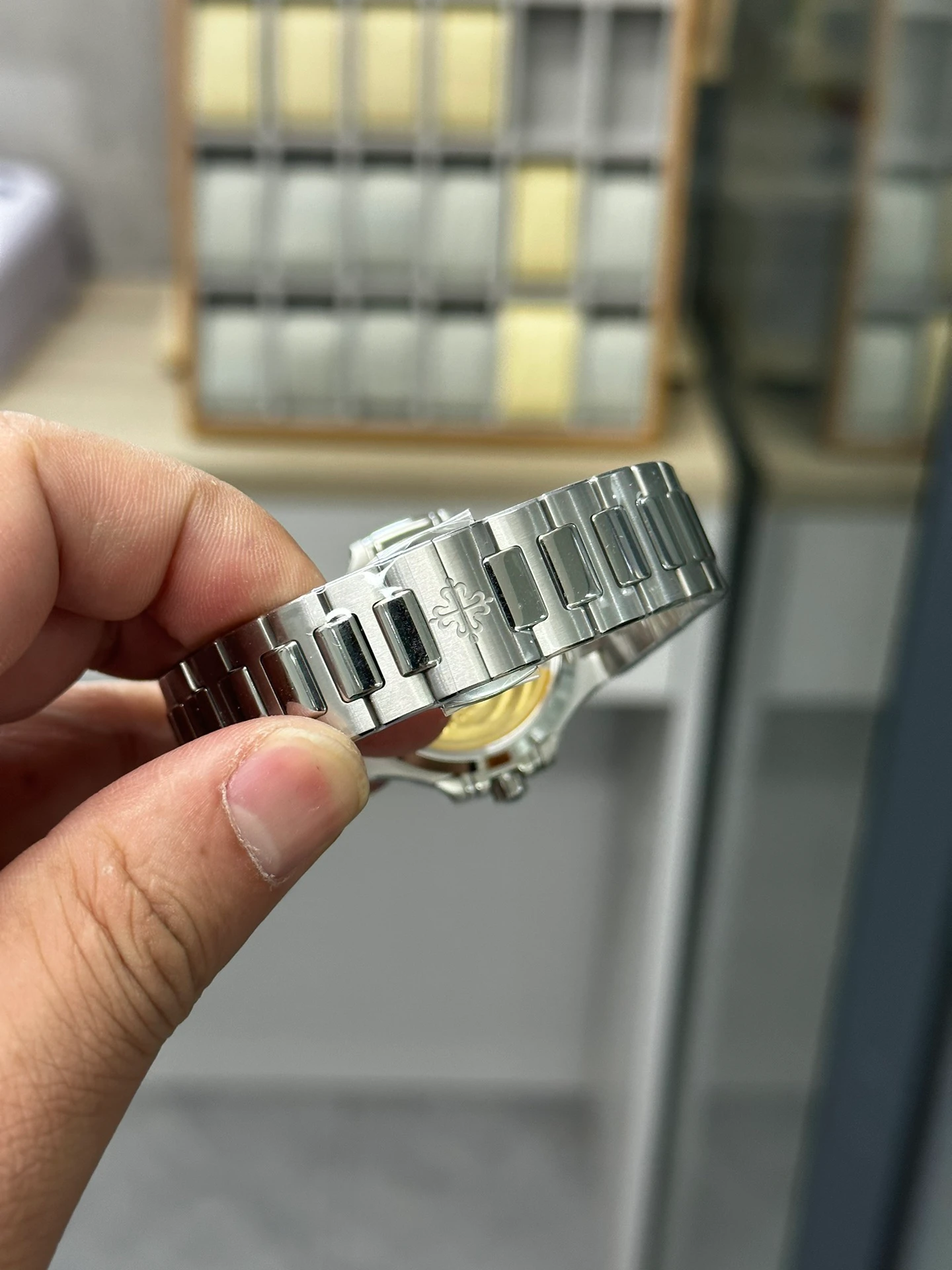 Integrated 904L steel, flush at the first link. Same graduating link construction as all 7118 steel models. Alternating brushed and polished surfaces. With the smoke gray dial, the bracelet and case read as one continuous steel surface. A sportier proposition than the Twenty~4 line. Compare against the blue version in the Nautilus collection.