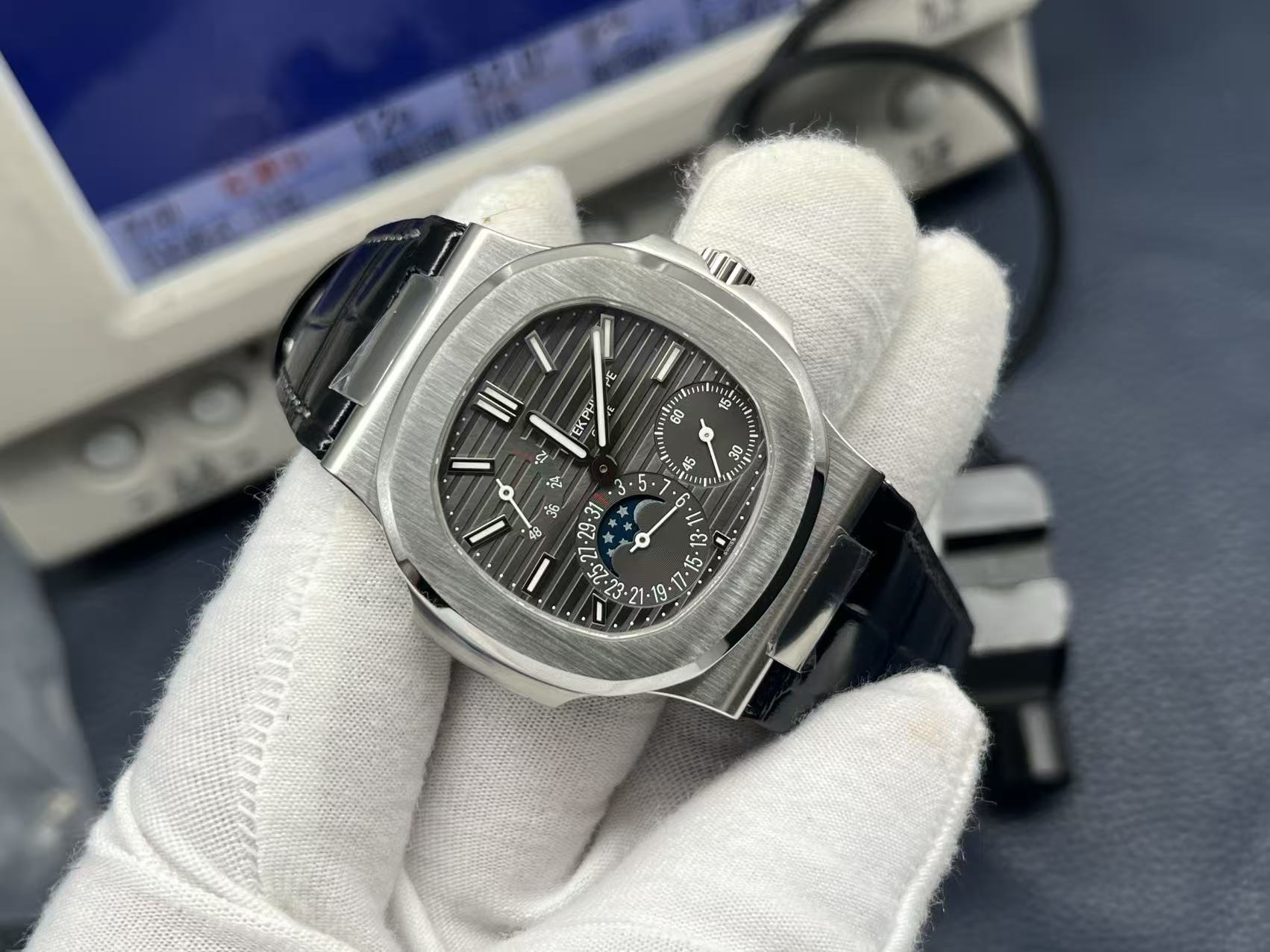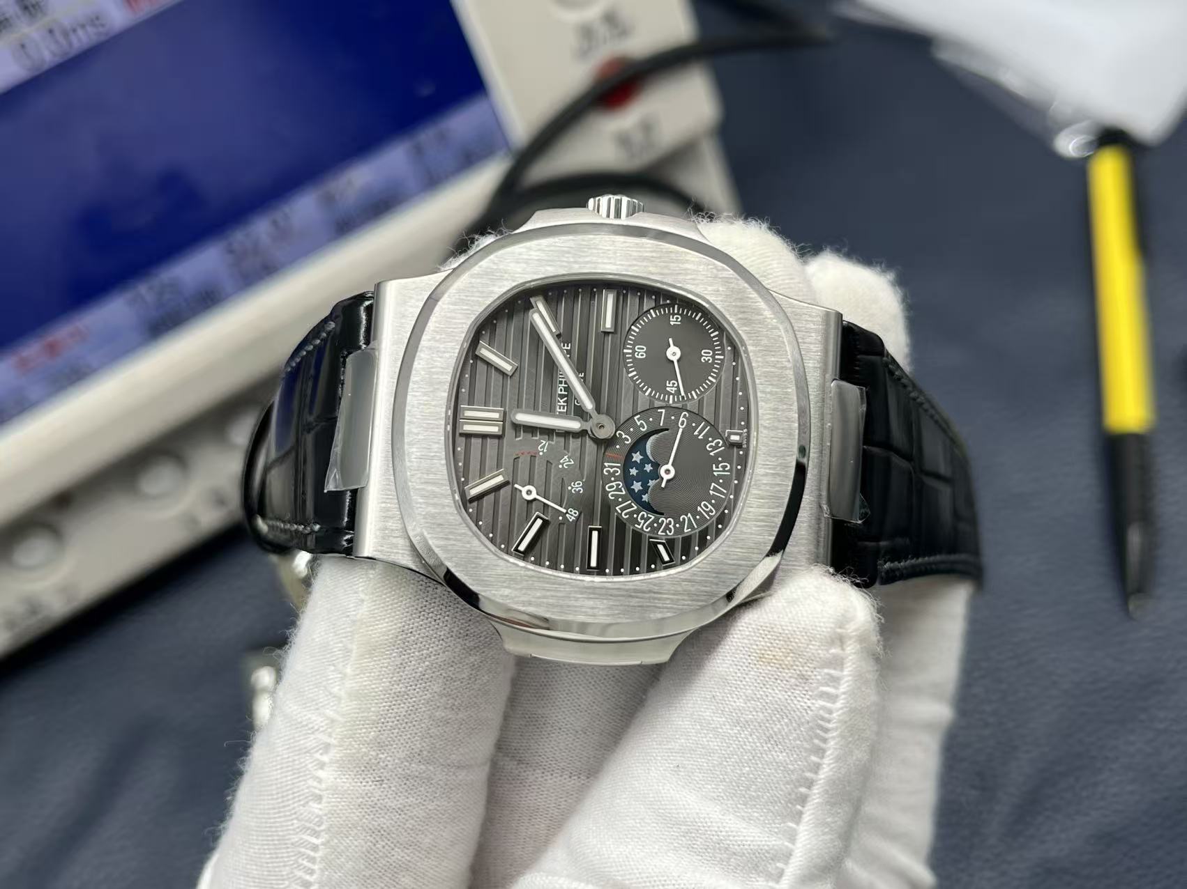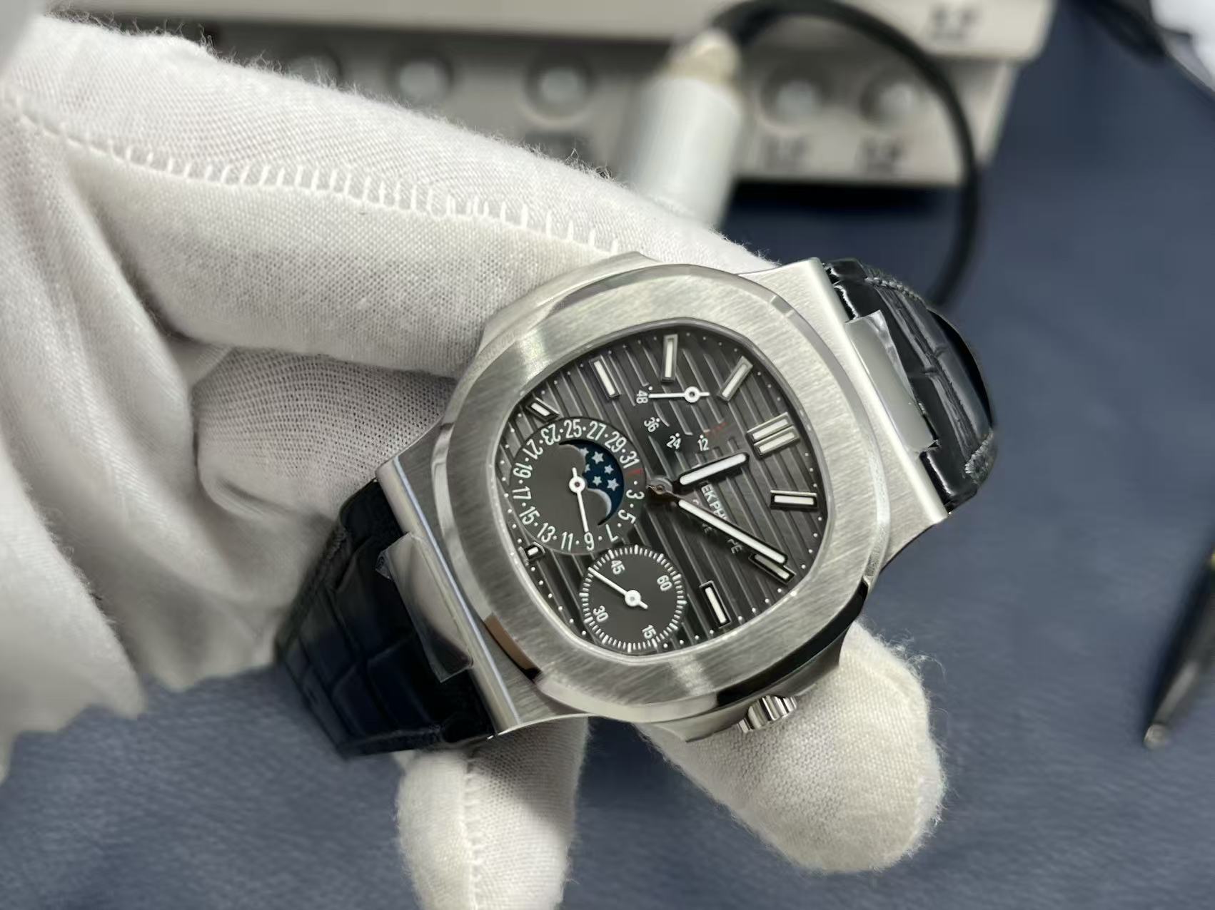White-gold 5712G-001 originals trade around $85K on secondary markets. This Nautilus 5712 replica matches the same 40 mm Moon Phase layout — same three-complication dial, same thin case profile. Full Nautilus collection | Contact us