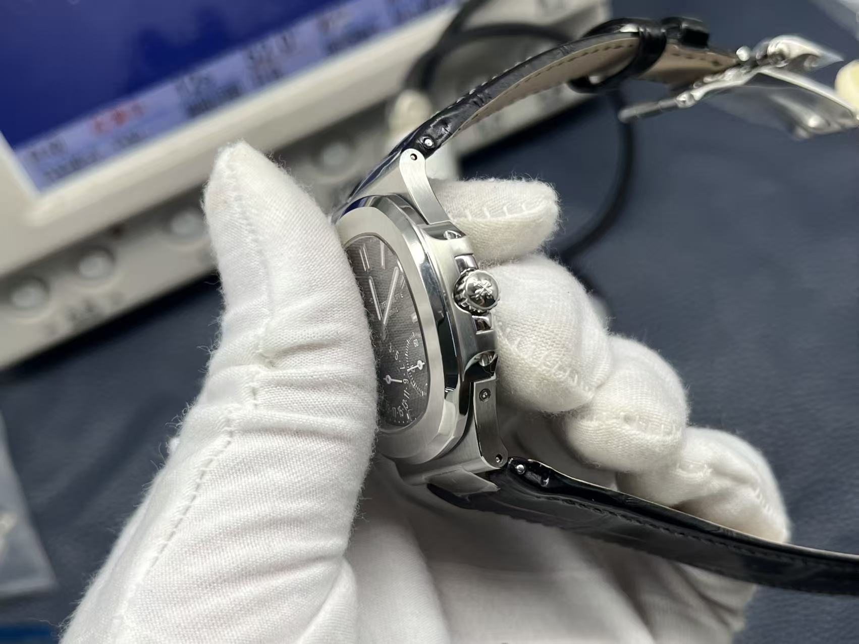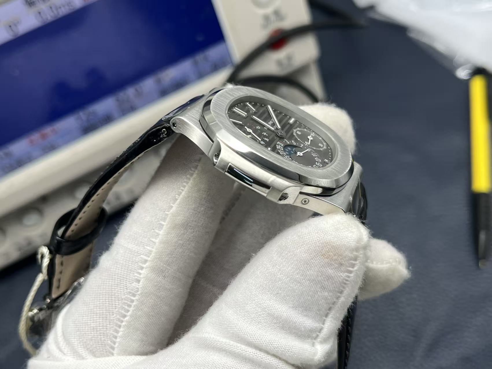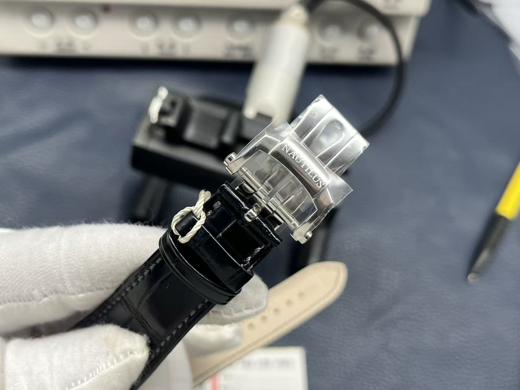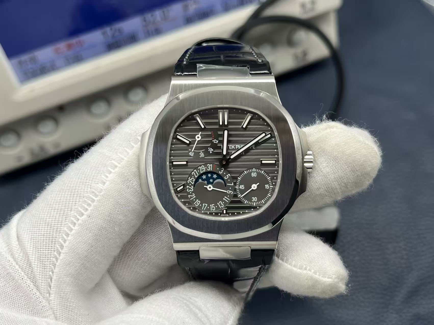 White-gold 5712G-001 originals trade around $85K on secondary markets. This Nautilus 5712 replica matches the same 40 mm Moon Phase layout — same three-complication dial, same thin case profile. Full Nautilus collection | Contact us
