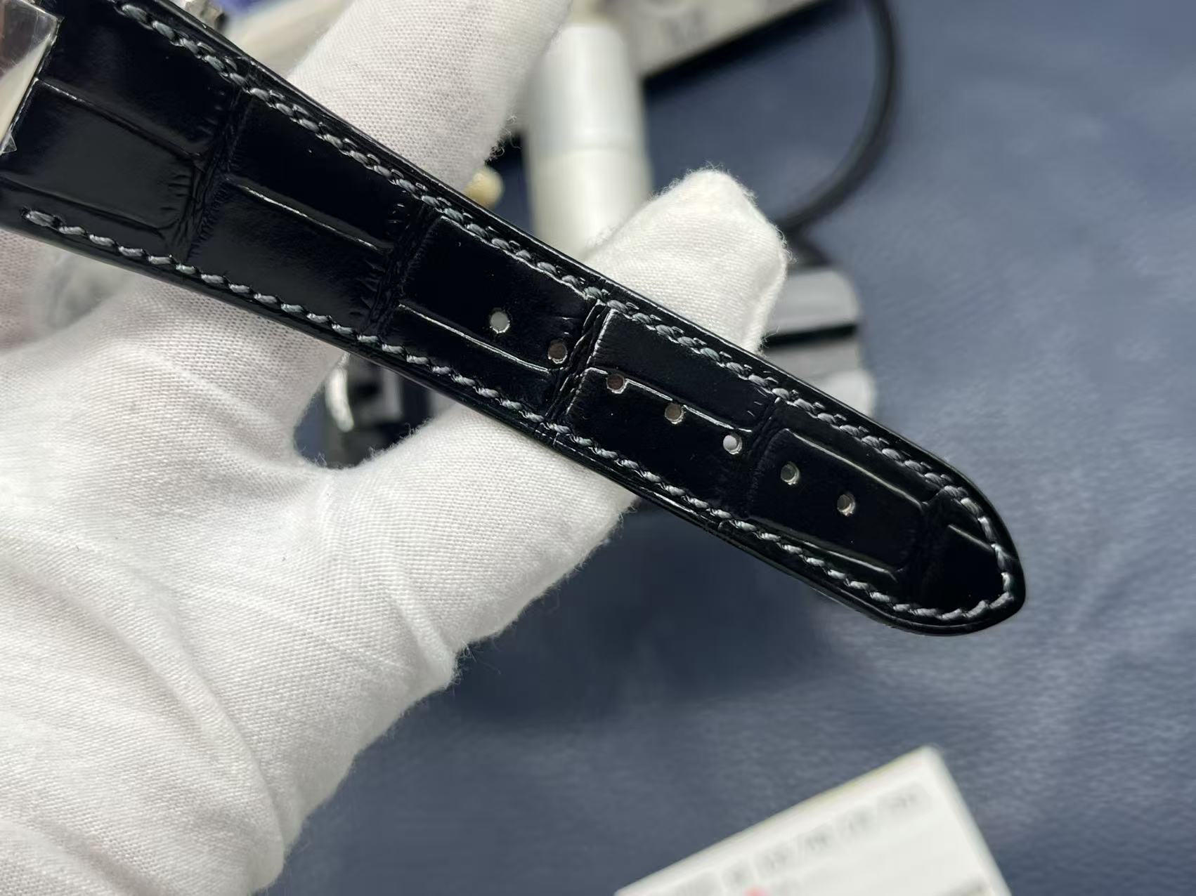 Matte black alligator-pattern leather, stitched edges, white-gold-tone pin buckle. Drops roughly 30 grams versus the integrated steel bracelet of the 5712/1A. Wears closer to how a Calatrava sits — dress watch weight, sport watch face.