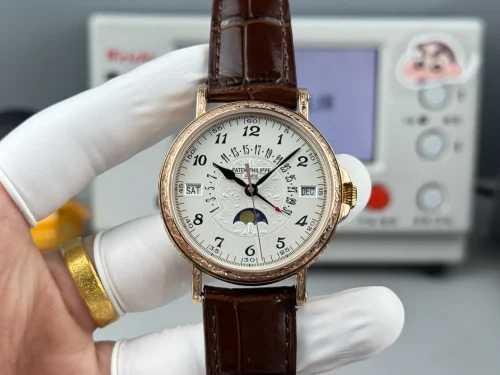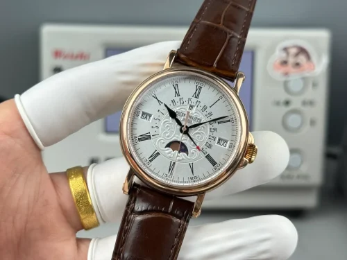 The Replica Patek Philippe 5159-003 is a grand complication perpetual calendar presented in a classic officer-style case with a distinctly traditional look. The yellow gold case paired with a brown leather strap gives the watch a warmer, more vintage-oriented appearance that suits formal and dress-focused wear. The dial layout is designed for clarity, keeping all calendar indications readable without visual clutter. This model follows the established design language of the