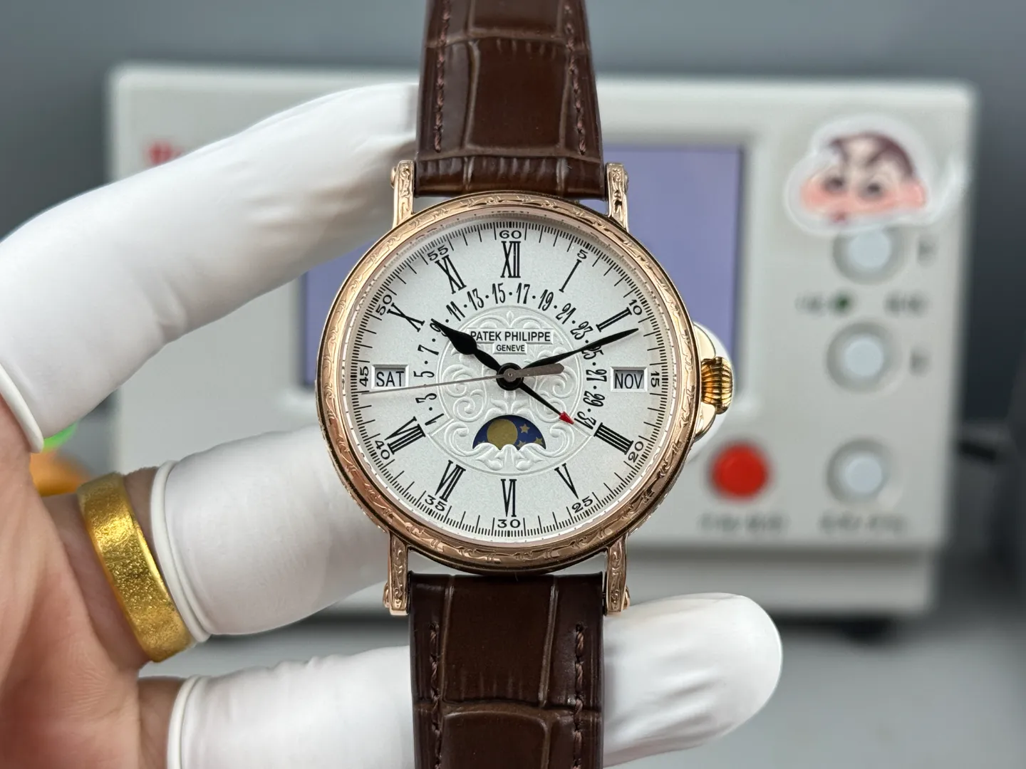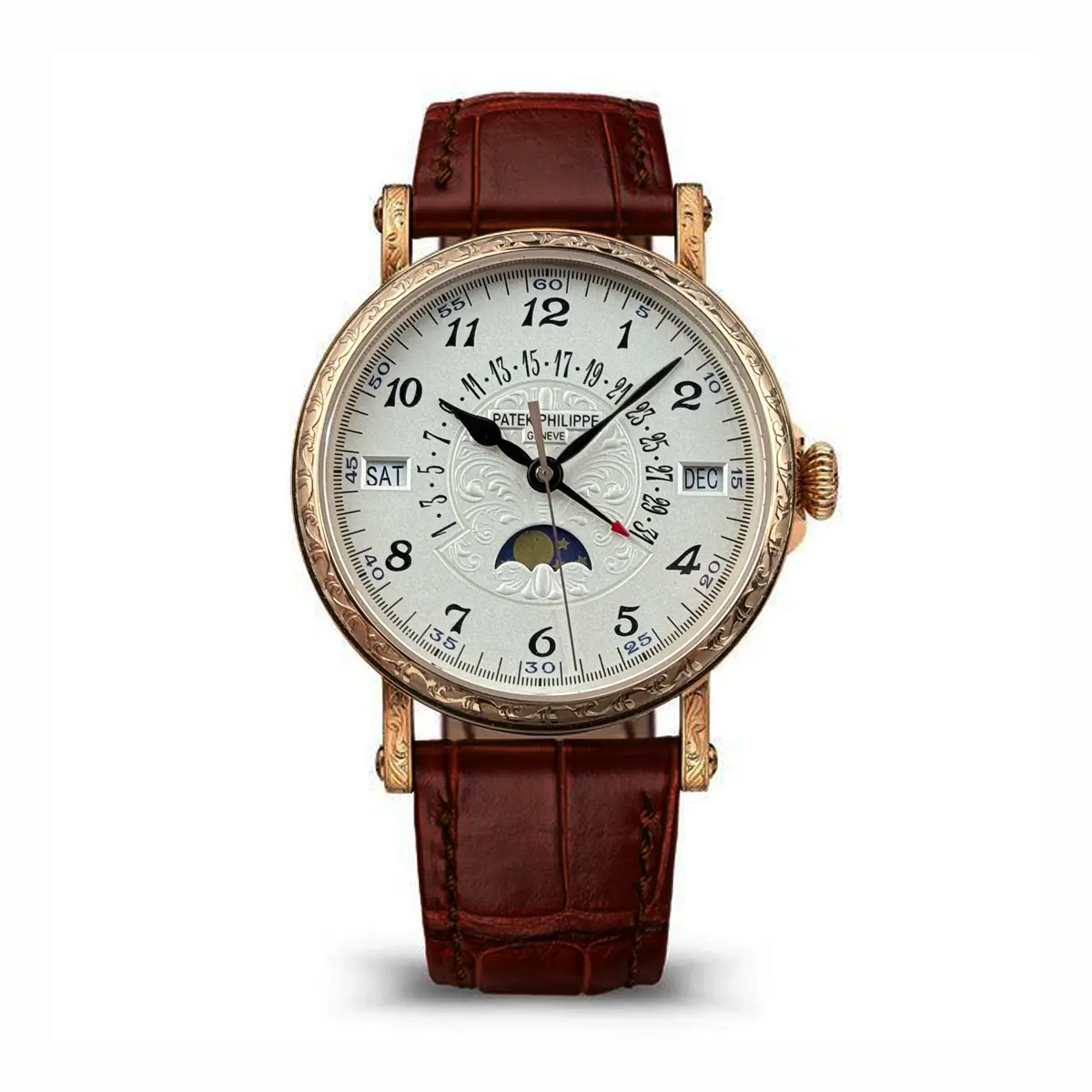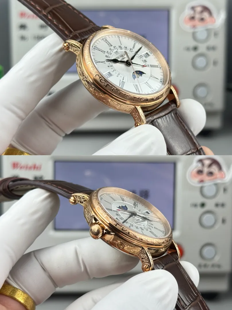 The perpetual calendar displays day, date, month, leap year, and moon phase in a symmetrical arrangement. Within the 5159 line, this version visually contrasts with the more reserved white gold black strap edition . All three references share the same case structure and complication layout, allowing buyers to choose primarily based on metal color and overall warmth.