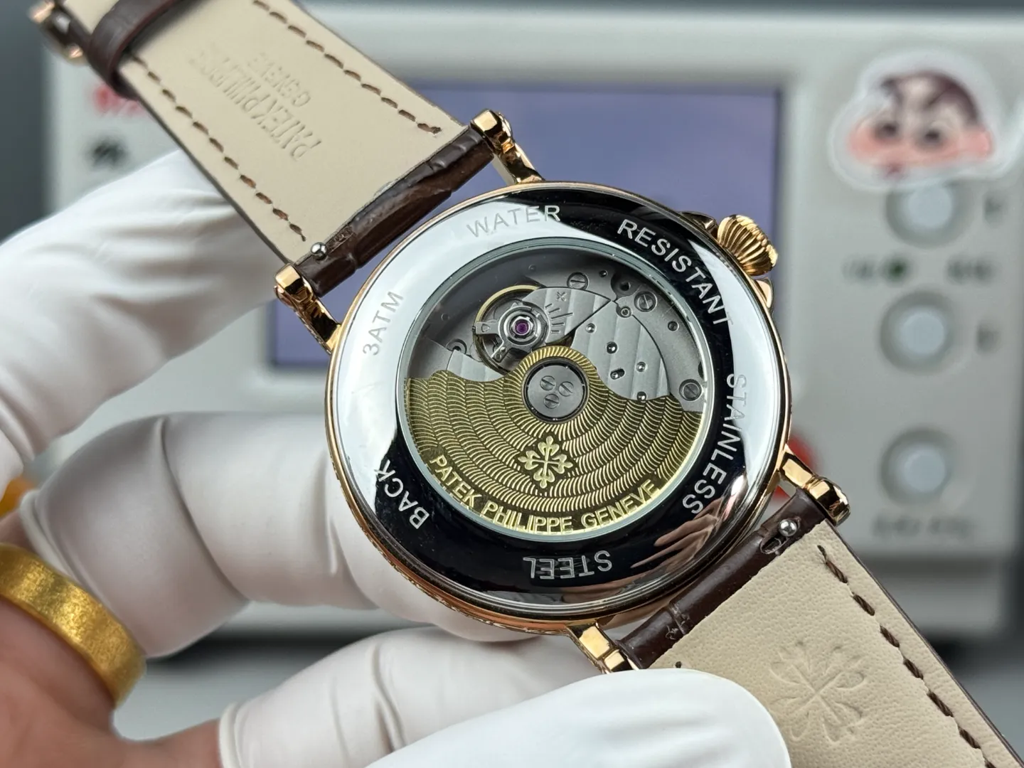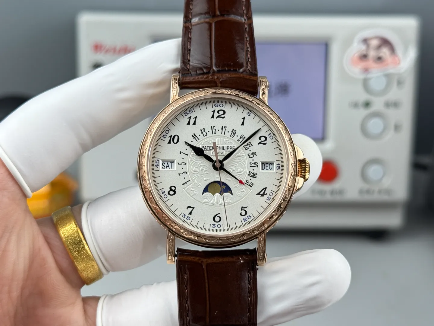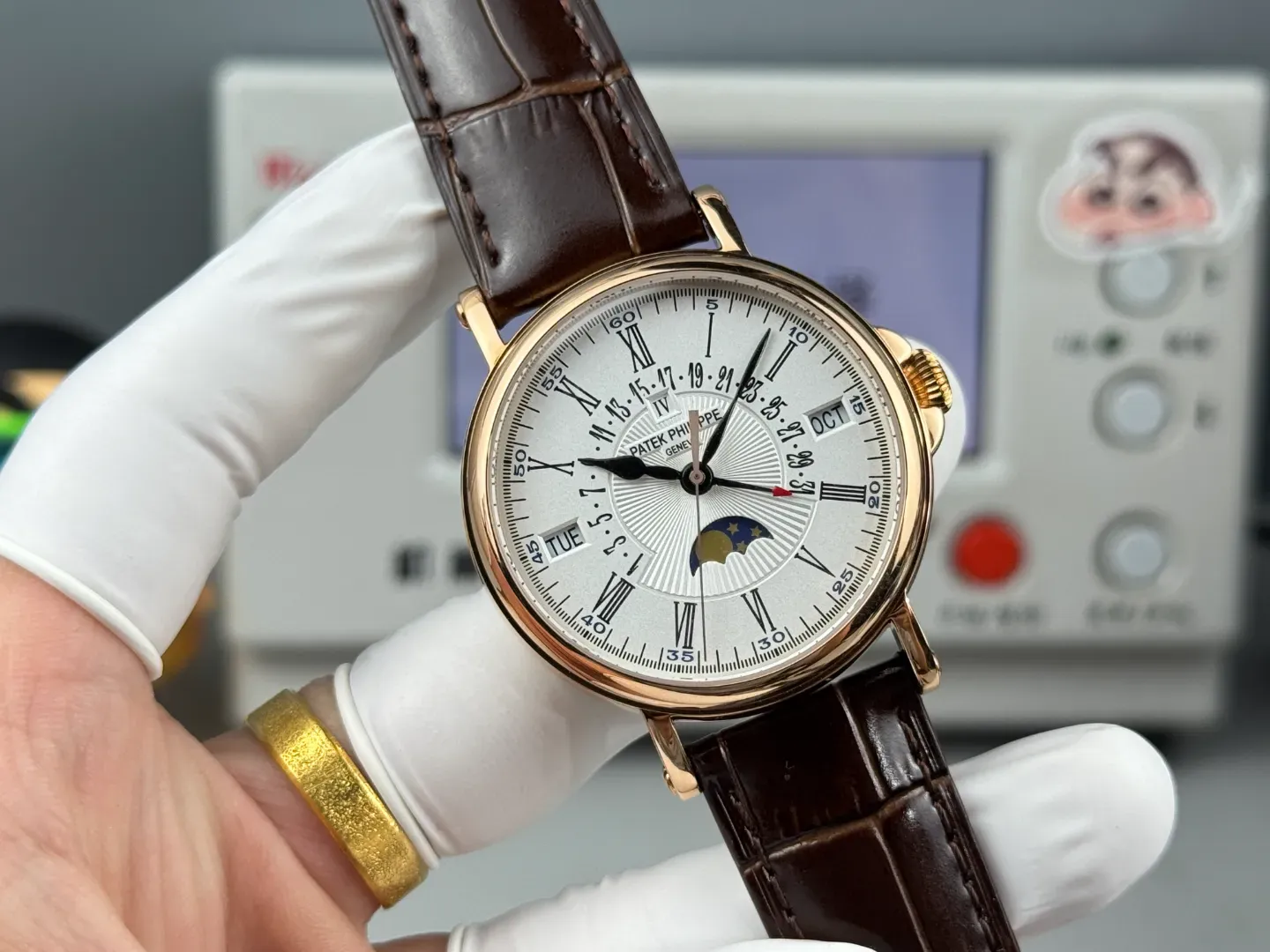 The perpetual calendar displays day, date, month, leap year, and moon phase in a symmetrical arrangement. Within the 5159 line, this version visually contrasts with the more reserved white gold black strap edition . All three references share the same case structure and complication layout, allowing buyers to choose primarily based on metal color and overall warmth.
