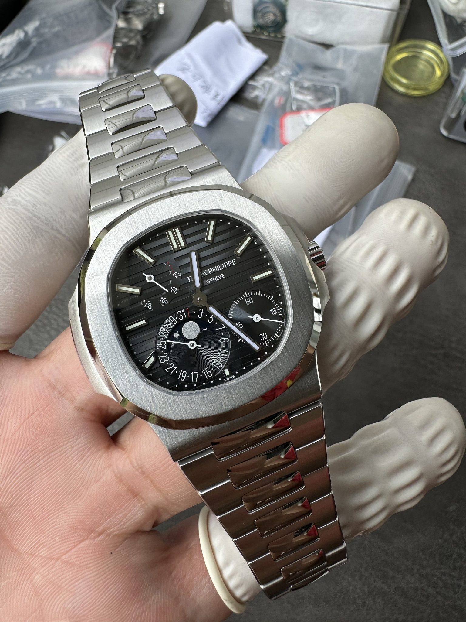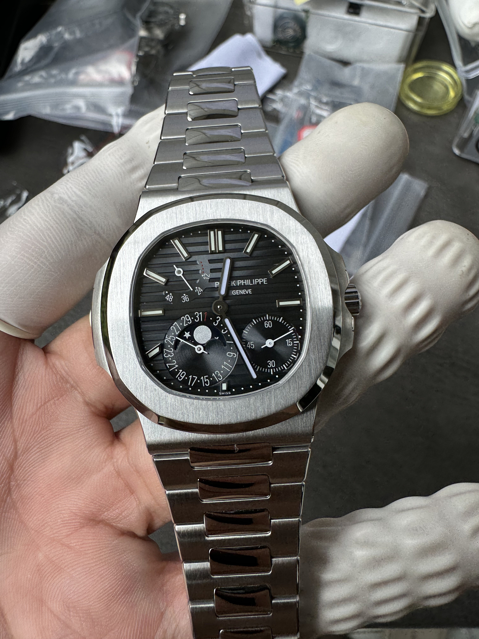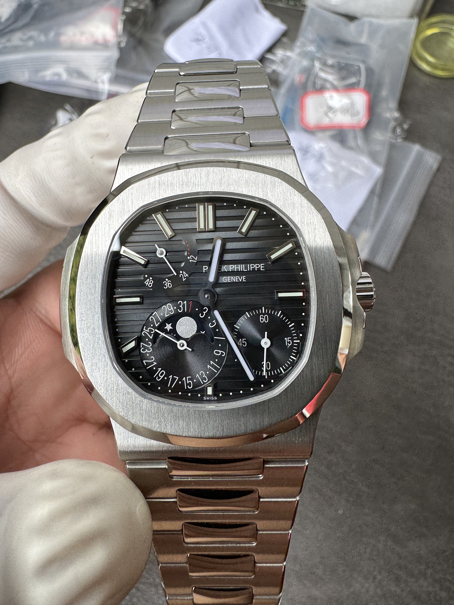Steel 5712/1A originals trade above $80K. This Nautilus 5712 replica delivers the same Moon Phase sport watch in a darker dial execution. Full Nautilus collection | Contact us