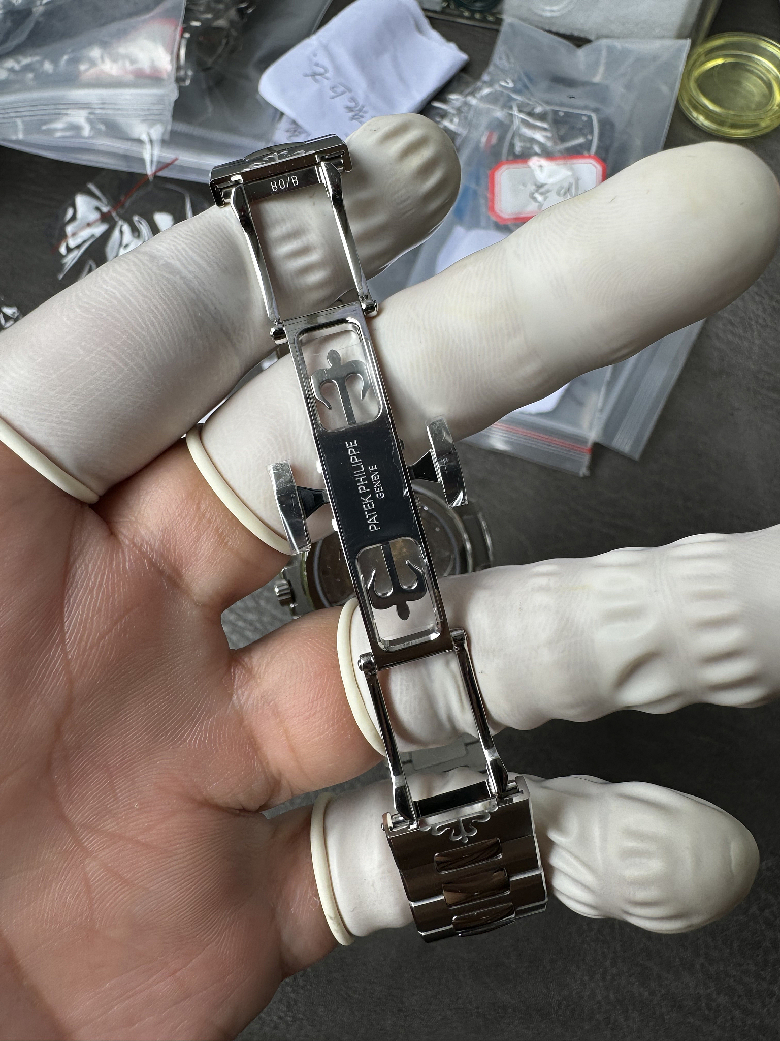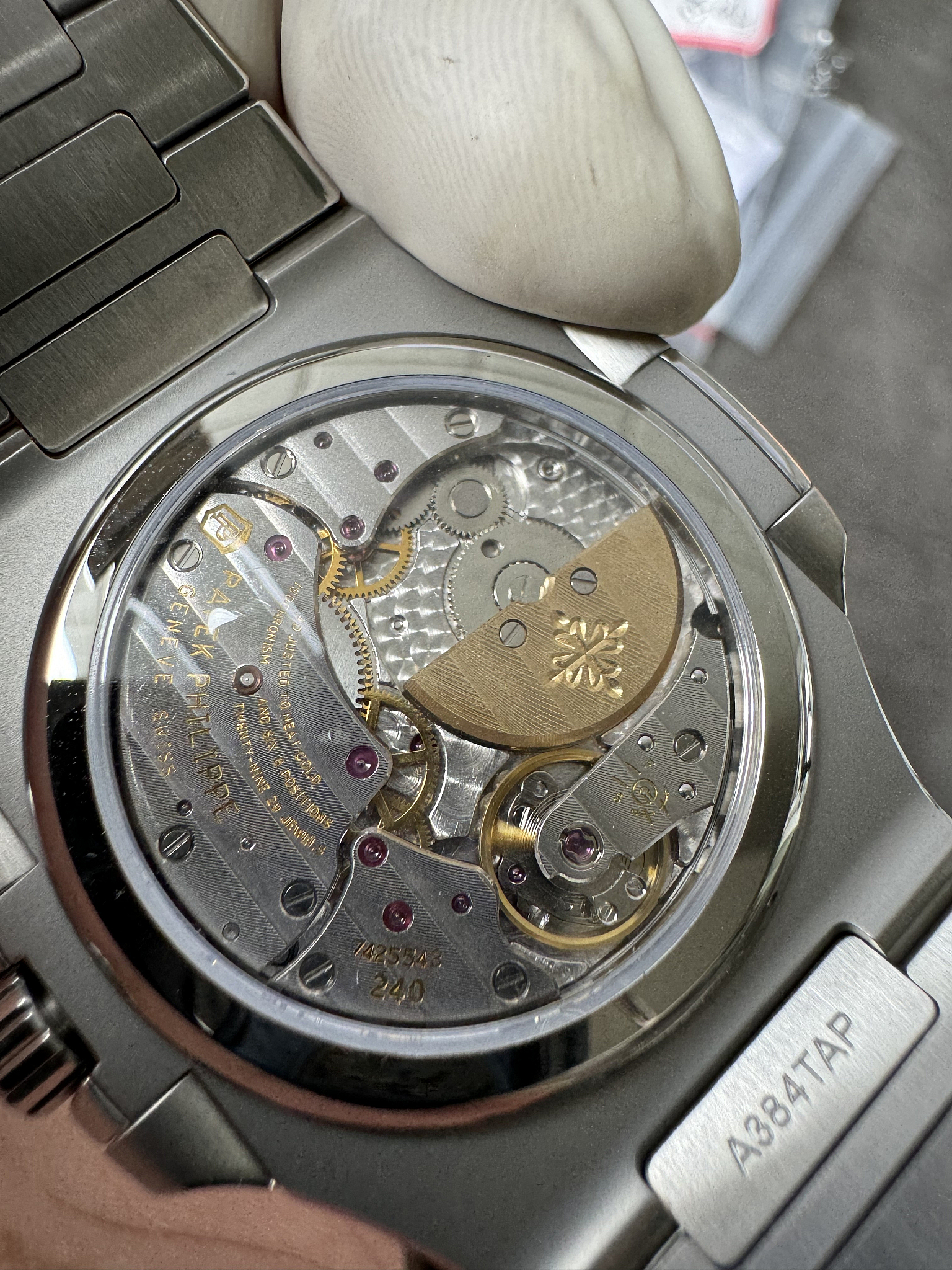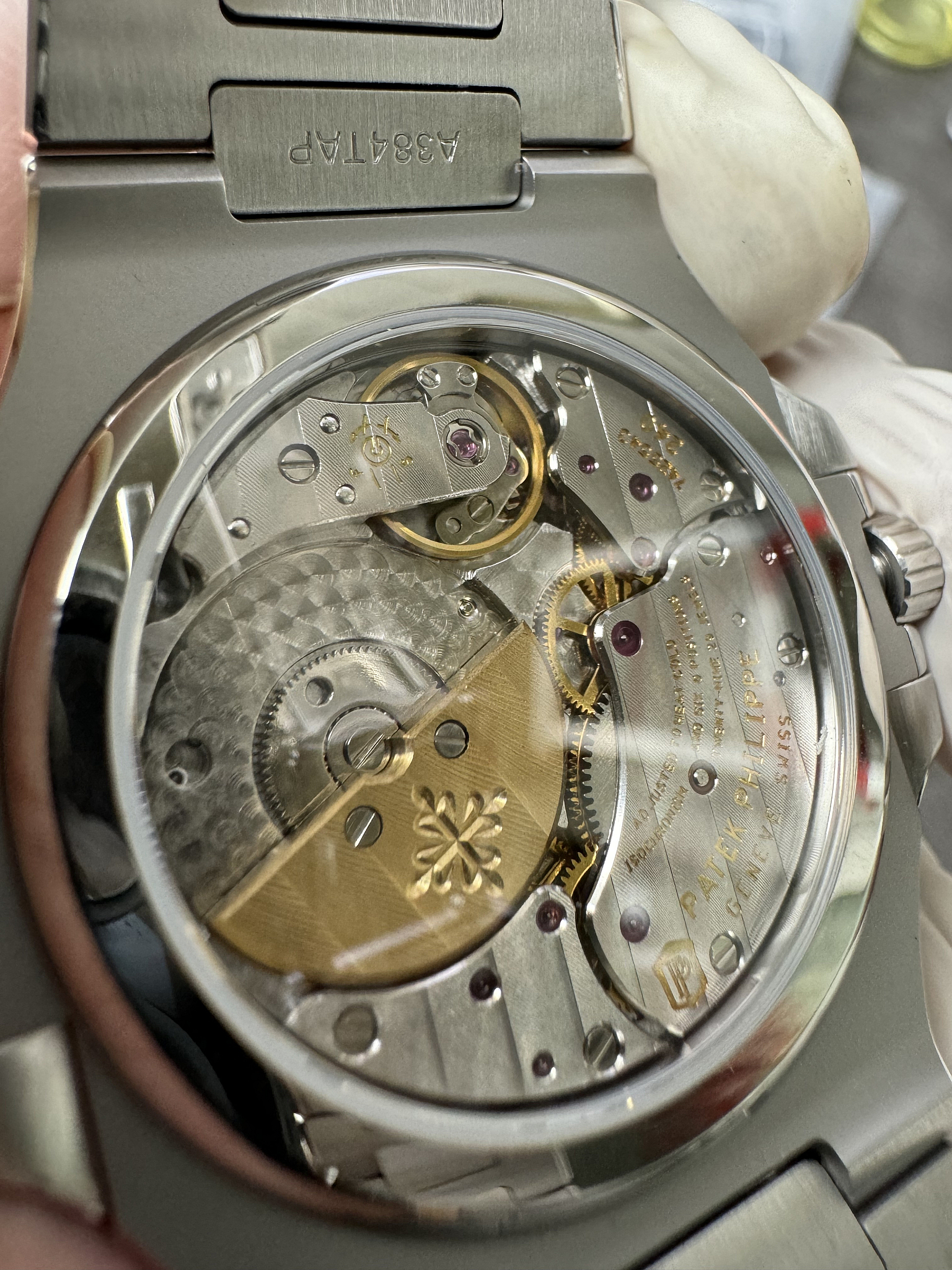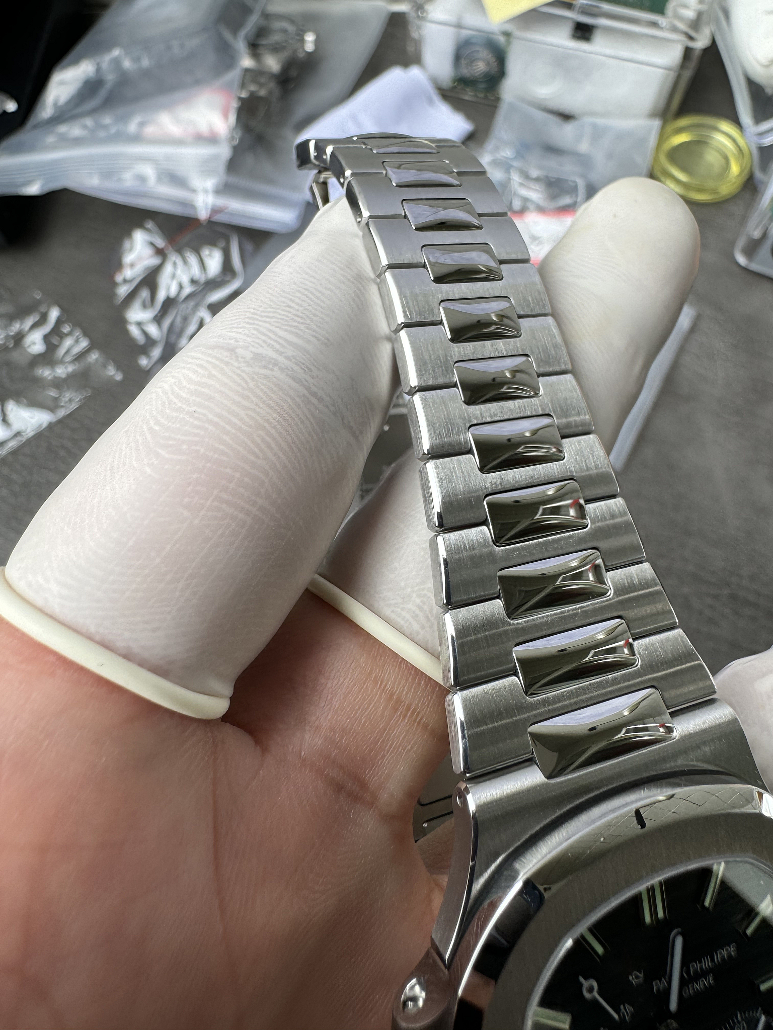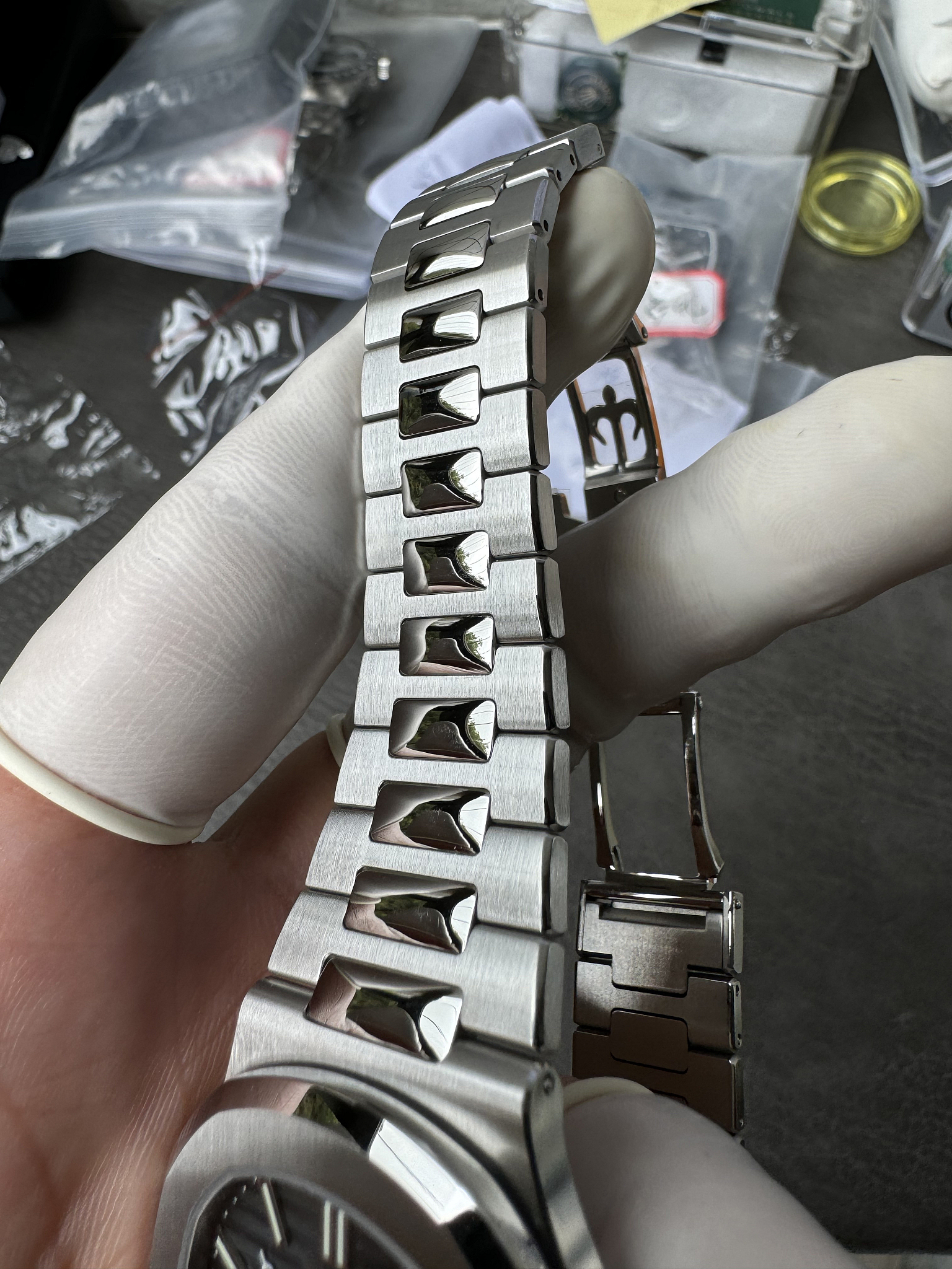 Integrated 904L steel, flush mount. Graduating links from lugs to deployment clasp, alternating satin-brushed and polished centres. The dark dial gives the bracelet more visual contrast than it has on lighter-dialed Nautilus models. A weightier option than the Aquanaut on rubber.