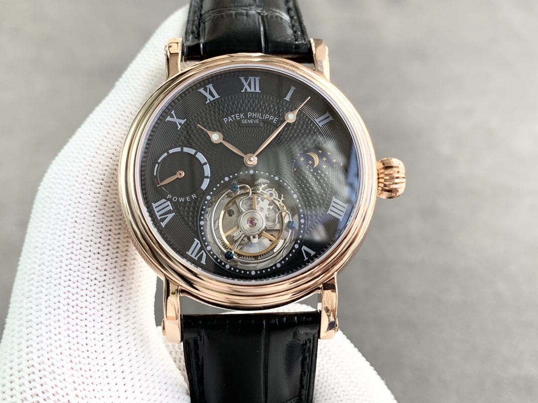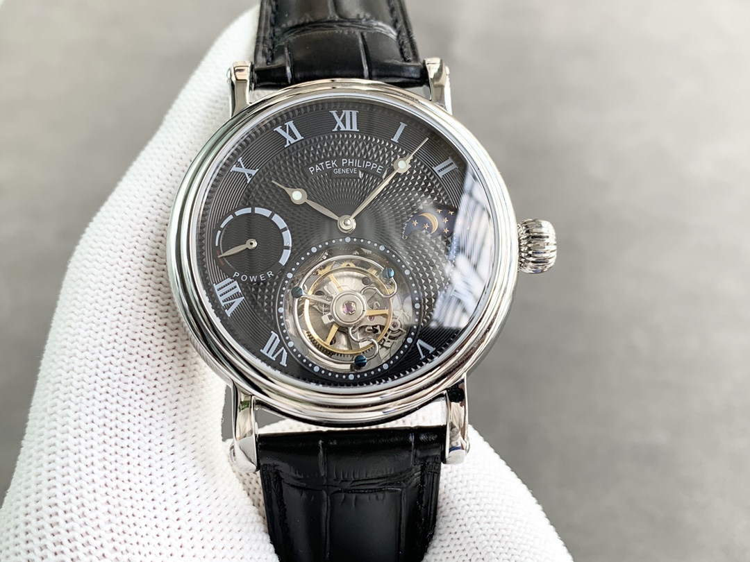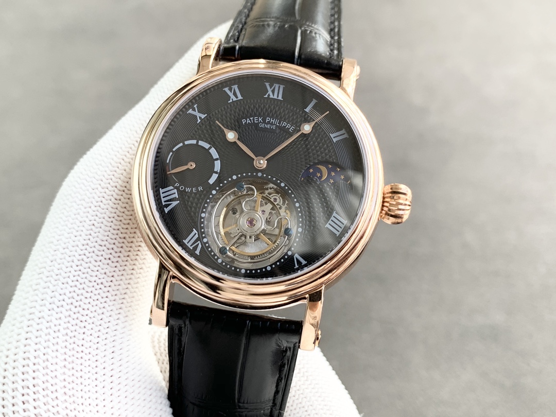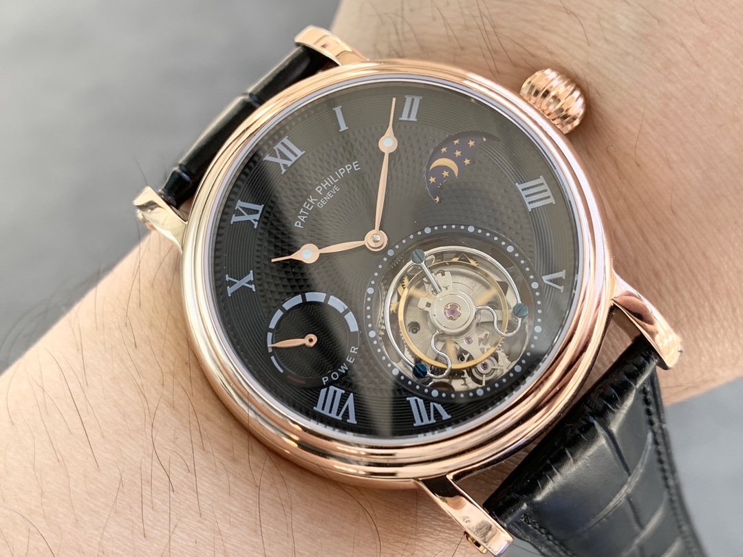 The Replica Patek Philippe Tourbillon Moonphase Black Dial combines a visible tourbillon with a moonphase display in a clear, balanced layout. The black dial boosts contrast, so you read the indications quickly and you keep the focus on the tourbillon opening. At the same time, the dial avoids visual noise and keeps the design clean for formal wear. Moreover, the watch supports daily use because the dark surface hides minor marks better than lighter dials. This model sits in the